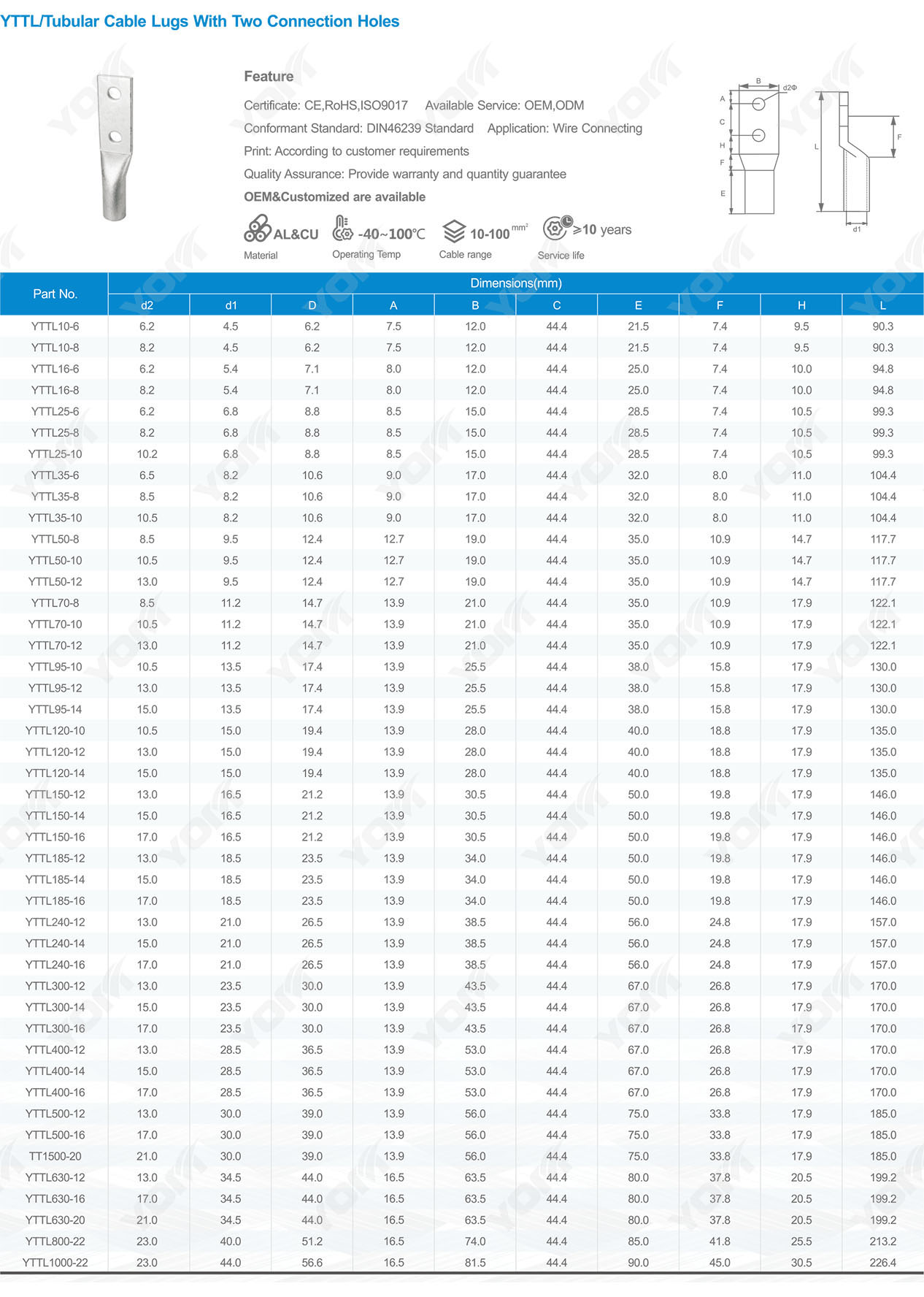 YTTL/Tubular Cable Lugs With Two Connection Holes